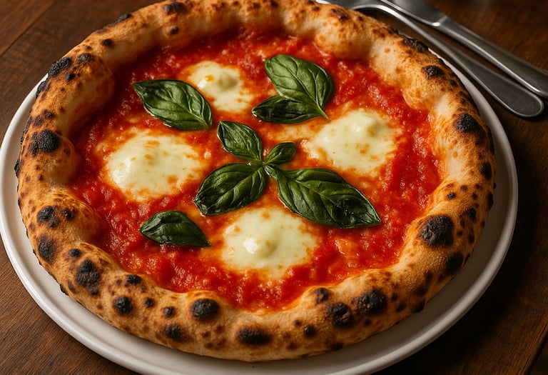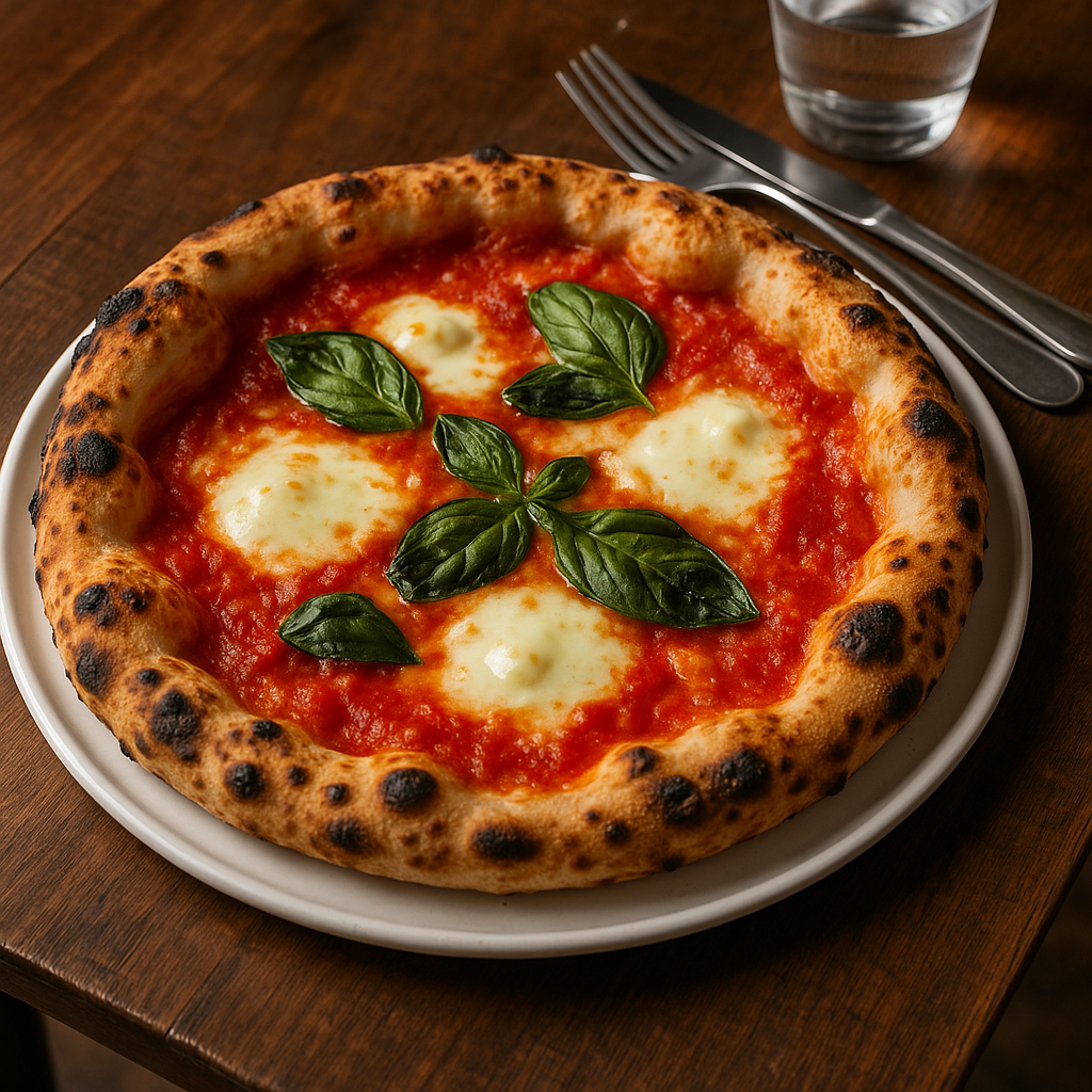 Pizza clásica con tomate pomodoro italiano, mozzarella fior di latte y hojas de albahaca.